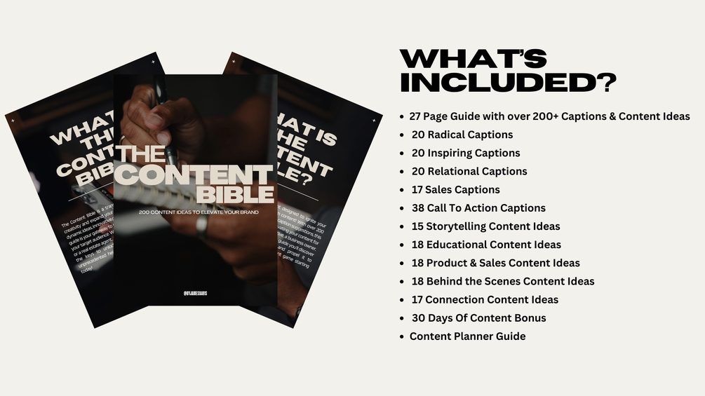 The Content Bible is a transformative blueprint designed to ignite your creativity and expand your reach with short-form content! With over 200 dynamic ideas, innovative concepts, and compelling caption suggestions, this guide is your gateway to growing, expanding, and elevating your content for your target audience. Whether you're a visionary creative, a business owner, or a real estate agent...CONTENT IS EVERYTHING. In this guide you’ll discover the keys to unlock your content's full potential and propel it to unprecedented heights of success. Elevate your content game starting today!